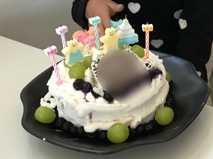 自家製ケーキ。生クリームは上の子が泡だてて、ちゃんと9本ローソクたてて吹き消しました。