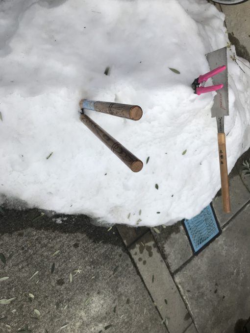 植木の手入れ2018.01.292018.01.28雪で玄関前に植えていたオリーブの気が壮絶に折れたので整えようと植木バサミやらノコギリやら出して手入れ。そしたらうまい具合に雪の山に刺さって作業が楽チン 雪にはこんな使い方もあったんだな