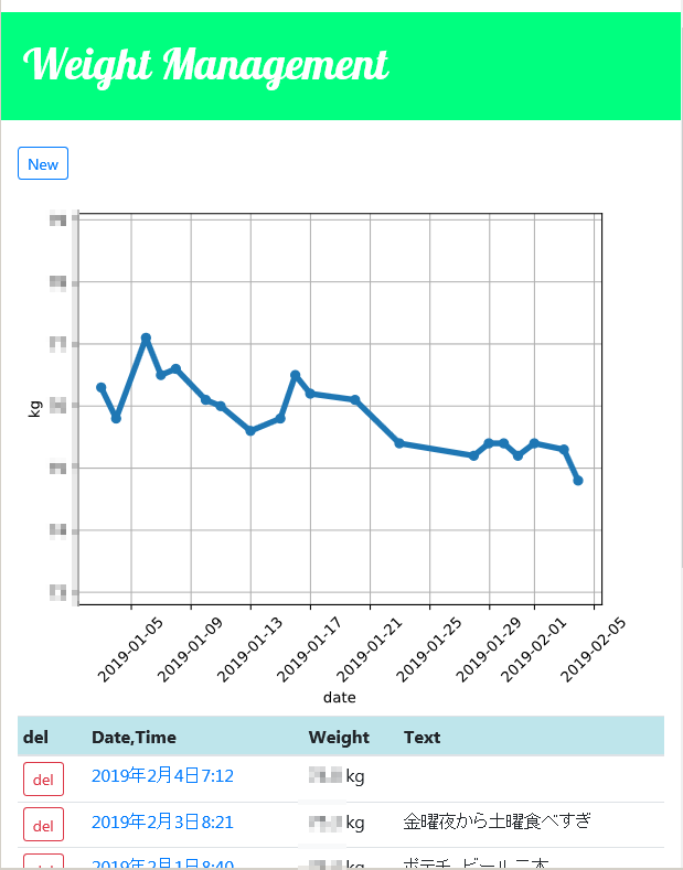 - Topページ:冒頭の画像のようにグラフと体重のリストを表示