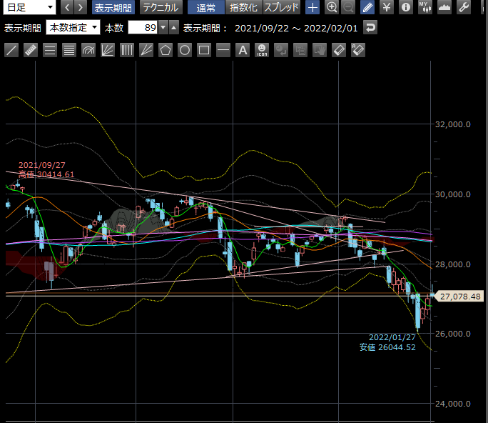その後、アメリカ先物が下がっていた事とか、27400超えたところで、ここ最近あげていたからか利食いですかね。10:15は下げてます。