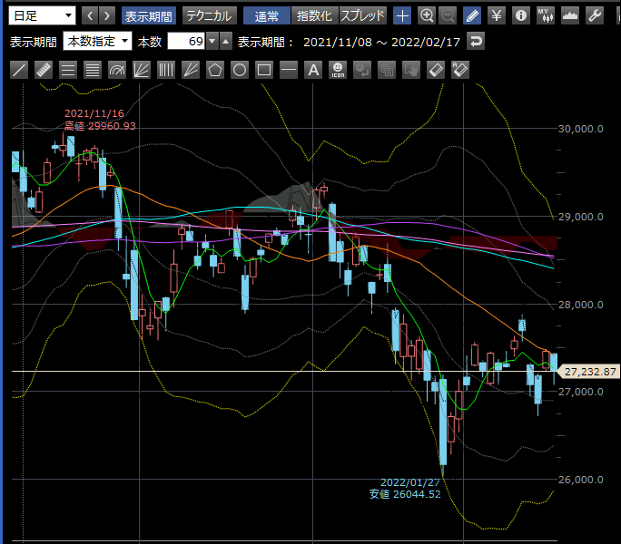 昨日600円くらい上げていたのと、アメリカがマチマチだったので上がるかどうかは微妙だと思っていましたが、午後になってウクライナ関連のニュースが出て下げましたね。
