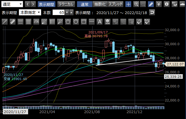 金曜夜の米3指数もマイナスで引けたし、ロシアが進行を決めたと確認している というバイデンのコメントがあったりで週明けも荒れそうですが、若干下髭の長いコマなので、頑張って上がっていってほしいです。(上がる材料がマイナス材料の好転しかないのがつらい)