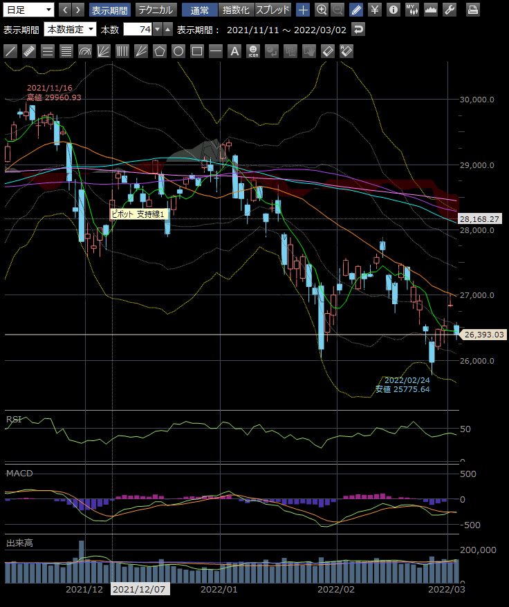 ウクライナ情勢も、ますます攻撃が激しくなっていたり、ロシアへの経済制裁影響懸念があるし、原油が100円超えてきていたり資源高でインフレ継続懸念の中で、今日の夜のパウエルさんの発言待ち みたいなのが重なった下げですかね。