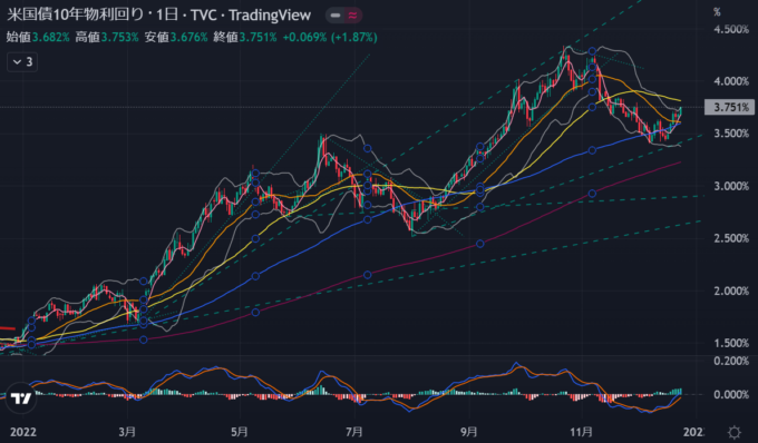 アメリカ10年債利回りのMACDが上昇反転、株価はまだ下落トレンドに見えるがどうなるか