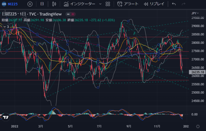 このあたりで反発するなら下落トレンドの抵抗線上抜けも期待できる気がするけど最近の動きを見ていると景気後退懸念で一旦逆業績相場的に下げるのかな。