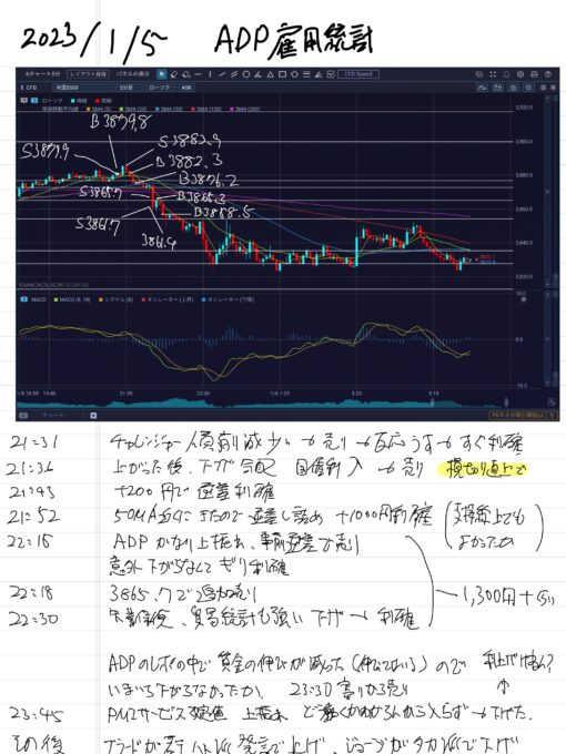その後失業保険、PMIサービス改定値も強かったから下げたけど、指標は出てみないとわからないことを考えるとルールに従って利益は取れたかなと。0:00くらいからの上げはなんだったんだろうな。。。