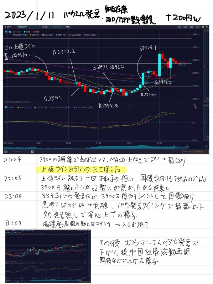 2023/1/10 パウエル発言、卸売在庫、景気楽観指数など 200円+2023.01.112023/1/10の間違えですね上がった理由が微妙だったのとパウエルさんの発言機会がいつ終わるかなどがわからなかったので早めの利確と終了。案の上、一旦下がった後上がるなど、一方的なトレンドにはならなかったのでやめておいて正解