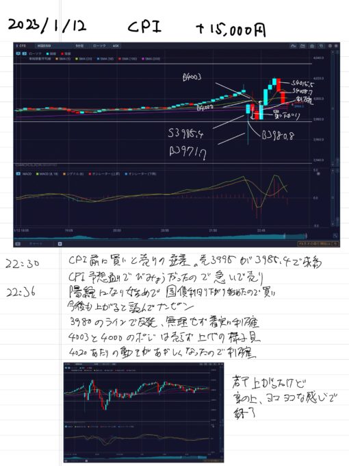 2023/1/12 CPI +15,0002023.01.13少しナンピンしたところがリスキー3980近辺まで下がってこない限り入らないとすべきだったか。今回はファンダと国債利回り信じて3980突き抜けるなら損切りと思って入ったけど、損失大きくなる思考ではある。