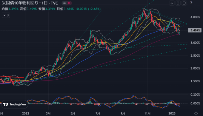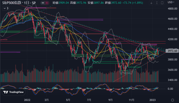 SP500が2022年年初来の下落トレンドの上値抵抗に差し掛かっていたので突破できるかに注目していましたが、FRB高官の冷や水(タカ発言)で落とされた印象。