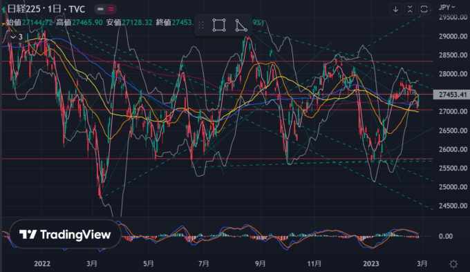水木はNVIDIA好決算で半導体関連が上げる中で四半期GSP・PCEの2発目の数字もよくなく、ヨコヨコで展開、金曜日のPCEが上振れで耐えきれず下げ、ただ、終盤下げ止まって少し戻すなど、底堅い感じ。ただ、週を通じて下げて年初来の上げのほとんどを戻している感じ。