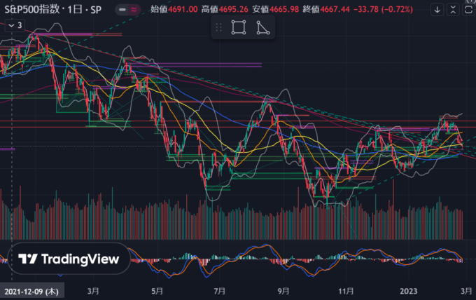 月曜日のアメリカ休場を挟んで、PMIの数字が強いのに反応して利上げ長期化懸念で下げ、小売り決算も先行き不安あり、あとは、おそらく前週までのFRB高官タカ派、強い指標の状況もあり株価は下落。プーチンの年次教書で地政学リスクが高まっていることもありそう。