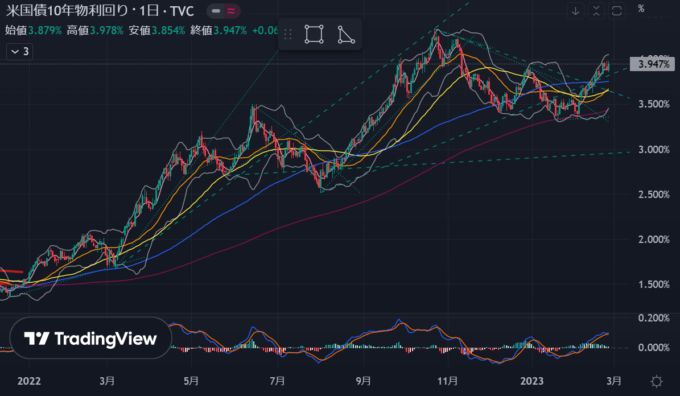 株が底堅いけど、ドル円は強含み、アメリカ国債利回りはドル円と株の中間くらい(上げ傾向ではあるけど)