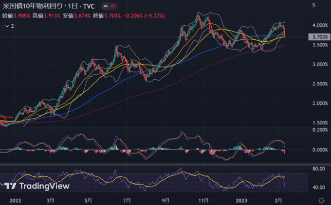その後にシリコンバレー銀行の破綻とシルバーゲートキャタルの業務縮小ニュースで市場がリスクオフに傾き、株安、国債利回り低下、ドル安に一気に動いた。