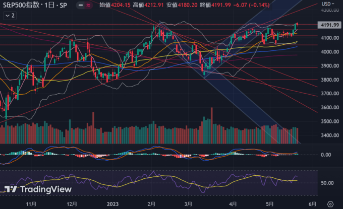 週中盤に債務上限問題についてバイデン・マッカーシーから楽観的な発言が出て、市場もそれを鵜呑みにして株上げになった印象。
