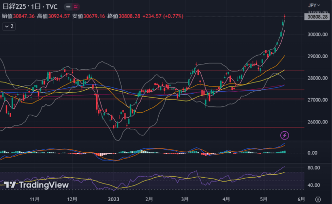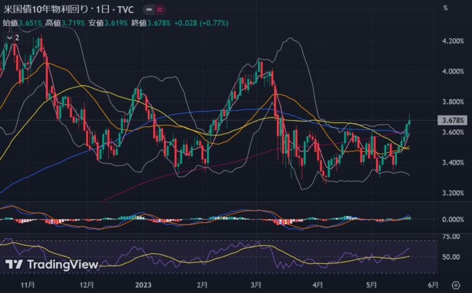 金曜日に債務上限問題の議論中断の報が出てもう少し下がるかなとも思ったが、パウエルさんが利上げ停止かも と示唆したこともあって綱引きな感じで底堅い。