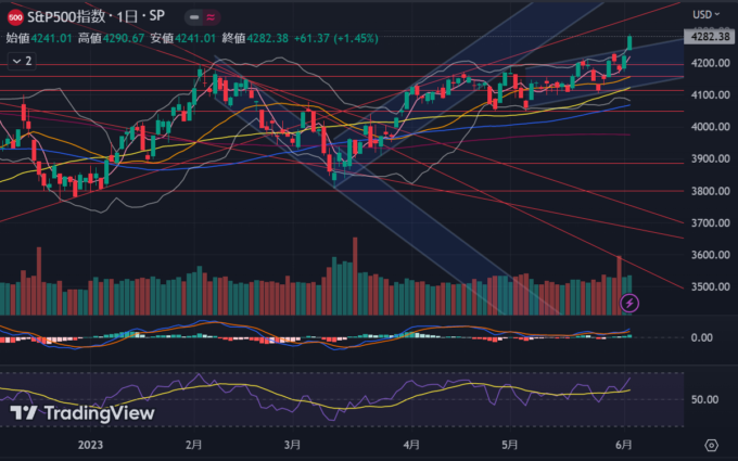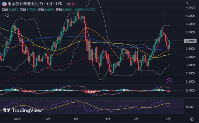 債務上限問題が結果的に6/2に決着。その前にイエレンさんが期限を6/1→6/5に伸びるとしたことで余裕がうまれてデフォルト懸念、格下げ懸念が後退したのがおおきかった感じ