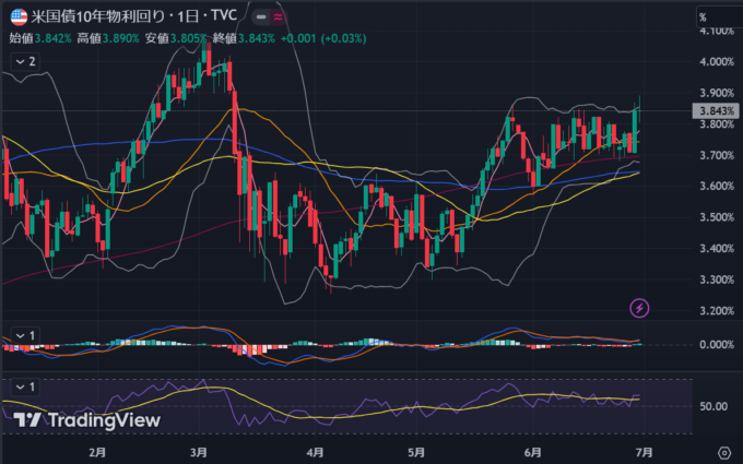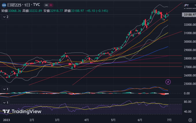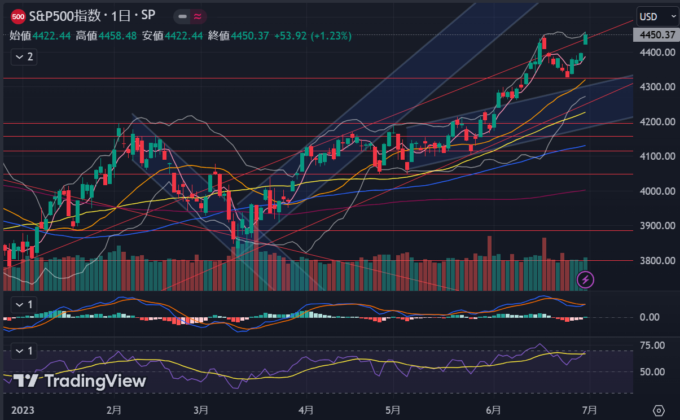 月曜日までは利確モードで売られていましたが、インフレ鈍化・景気好調で巻き返してますね。
