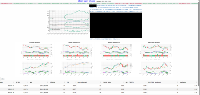 SP500とVIX,Fear & Greed,Put/Call Ratio, IG証券のセンチメントなんかをグラフで並べて表示したり